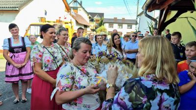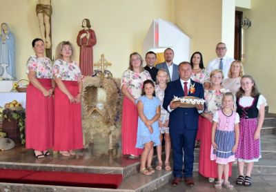 Kolejnym punktem programu, było przekazanie chleba dożynkowego przez starostów dożynek Ewę i Henryka Sladek na ręce włodarza gminy – Burmistrza Ozimka Mirosława Wieszołka. Po pobłogosławieniu chleba przez ks. Łukasza Szustra przystąpiono do pokrojenia i podzielenia go wśród zgromadzonych, tak aby nikomu go nigdy nie zabrakło.