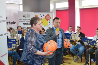 Następnie zaproszono wszystkich młodych sportowców, do odbioru legitymacji, materiałów oraz piłek, które otrzymali od Rafała Bartka, Anny Ludwig koordynatora NSP w Opolu oraz Tomasza Kaczmarzyka koordynatora NSP w Ozimku.