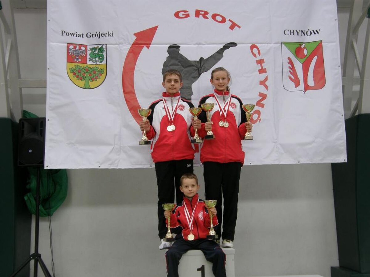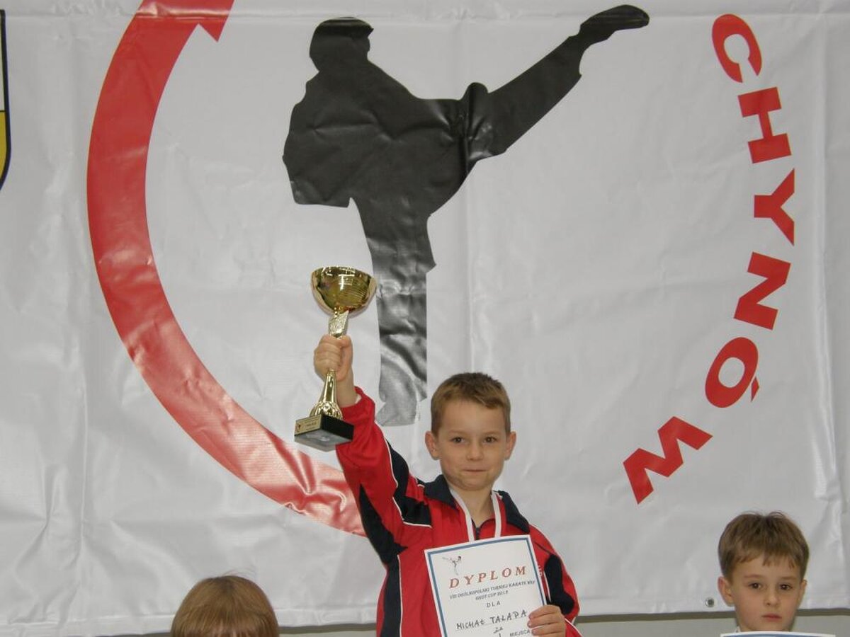 Jakiś czas temu wspominaliśmy o coraz lepszych osiągnięciach wychowanka naszej sekcji Karate Shotokan Rafała Talagi. Otóż bardzo miło nam poinformować że jego młodszy brat 7-mio letni Michał postanowił nie być gorszym i po roku od rozpoczęcia przygody z karate w ślad za Rafałem przywozi krążki z pierwszych ogólnopolskich zawodów. W dodatku aby troszkę nacisnąć bratu a odcisk zaczął kolekcjonować je od tych najcenniejszych czyli złotych. Michał w kwietniu wystartował na turniejach w Ścinawie VIII Otwarty Puchar Karate Goju-Ryu „Odra Cup” gdzie wystartował w dwóch konkurencjach i w obu zdobył złote medale ,do których Rafał dołożył swoje dwa złota. Tydzień później chłopaki na Ogólnopolskim Turnieju Karate „GROT CUP 2013”w Chynowie nie pozostawili złudzeń reszcie startujących wywożąc również po dwa złote krążki. Widać że rywalizacja na tytuły mistrzowskie działa motywująco na braci. Życzymy kolejnych sukcesów.