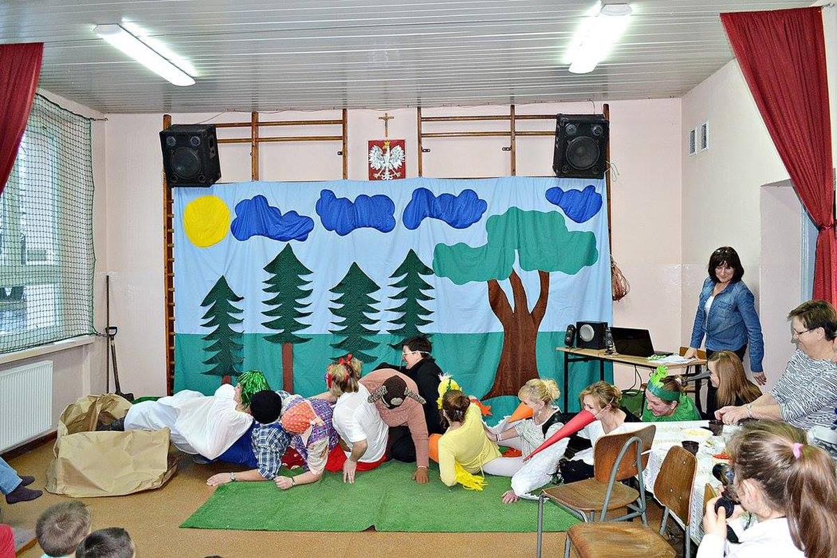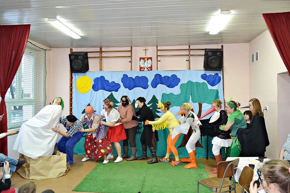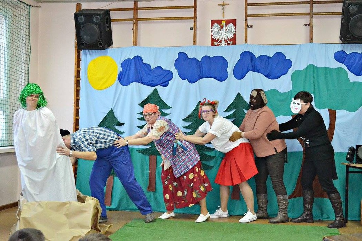 Wychowawczyni Pani Eleonora Palt zaangażowała w świetne przedstawienie również rodziców swoich podopiecznych. Dzieci recytowały wiersze oraz zaśpiewały wspólnie sto lat, a rodzice przedstawili „Rzepkę” Juliana Tuwima nie zapominając przy tym o barwnych przebraniach. W rolę narratora wcieliła się Bernadeta Gonsior.