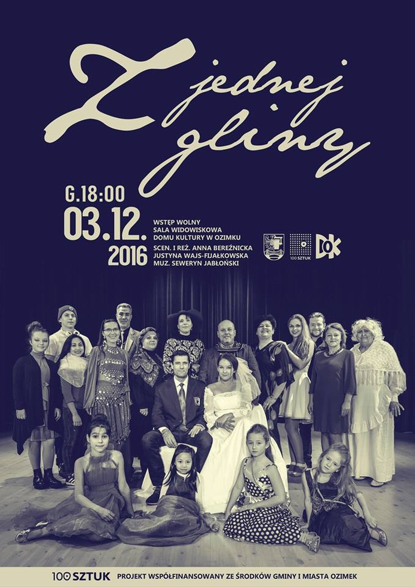INFORMUJEMY, ŻE NA SPEKTAKL 3 grudnia 2016r., o godz. 18.00 na sali widowiskowej Domu Kultury w Ozimku, gdzie odbędzie się ozimska premiera spektaklu pt. "Z jednej gliny", wykonanego przez Teatr Intergalaktyczny założony przez Stowarzyszenie 100 SZTUK - NIE MA JUŻ WEJŚCIÓWEK