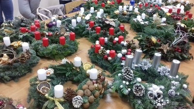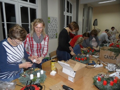 W piątkowy wieczór, dn. 29.11.2019r. w świetlicy "Starej Szkoły" spotkały się mieszkanki Krasiejowa, aby wziąć udział w adwentowo - świątecznych warsztatach florystycznych. Zajęcia prowadziła Katarzyna Sklorz, która od dwóch lat uczy nas wspaniałej sztuki tworzenia małych artystycznych dzieł. Do prac włączały się też dzieci, które na spotkanie przyszły razem z mamami lub babciami. Podczas warsztatów prowadzone były zajęcia językowe dla najmłodszych, które prowadziły panie Marzena Misz i Sylwia Widawska. Dzieci malowały, łączyły w pary symbole świąteczne, czytały wiersz o Mikołaju, gromadziły słownictwo wokół tematu adwent i Mikołaj. Prace artystyczne w postaci stroików powstałe pod okiem florystki Kasi wprawiły w zachwyt ją samą. Wszyscy bez wyjątku bardzo mocno angażowali się w wykonanie jak najpiękniejszego adwentowego stroika, a niektórym paniom udało się zrobić aż dwa. Spotkanie było okazją do miłego integrowania się, pielęgnowania śląskich tradycji, ale i okazją do posmakowania dobrego kołocza i wypicia smacznej kawy.