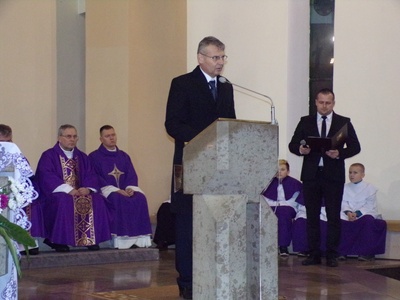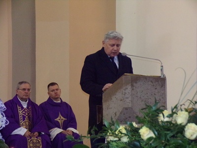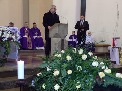 Proboszcz Demarczyk podczas kazania mówił o zmarłym burmistrzu – „podjął się misji służby drugiemu człowiekowi i naszej społeczności (…) nasza tu obecność to świadectwo, że rzeczywiście był dobrym włodarzem, był dla nas, dla społeczności bardzo dostępny” – zaznaczył.