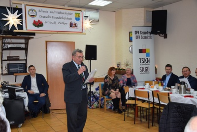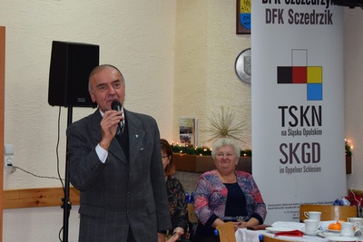 Na wstępie Klaus Leschik przewodniczący DFK Szczedrzyk i Pustków przywitał zebranych oraz zaproszonych gości posła Ryszarda Gallę, radnych powiatowych Antoniego Gryca i Krzysztofa Koźlika, sołtysa wsi i radnego miejskiego Mirosława Wieszołka, szefową Caritas Szczedrzyk Bernadettę Golomb i przewodniczącego Stowarzyszenia Przyjaciół Szczedrzyka Kazimierza Udolfa.