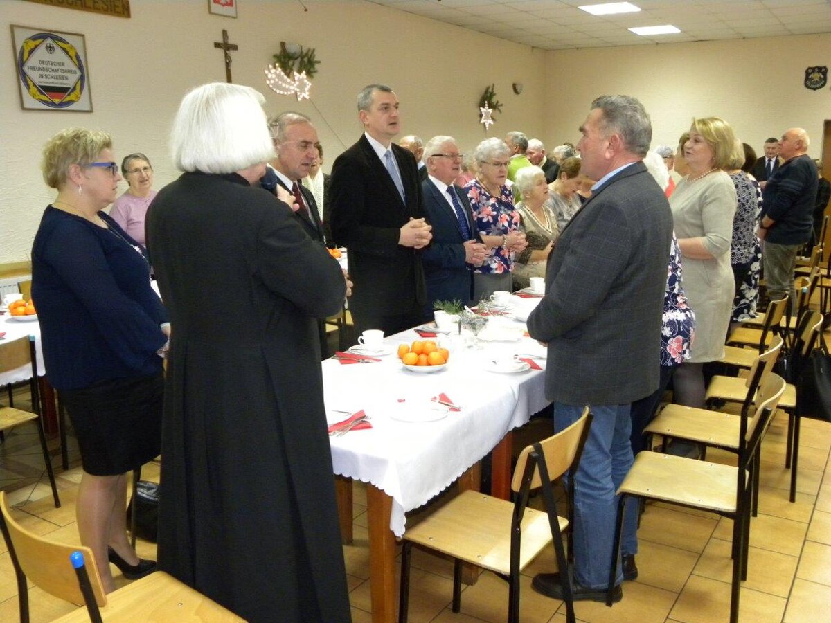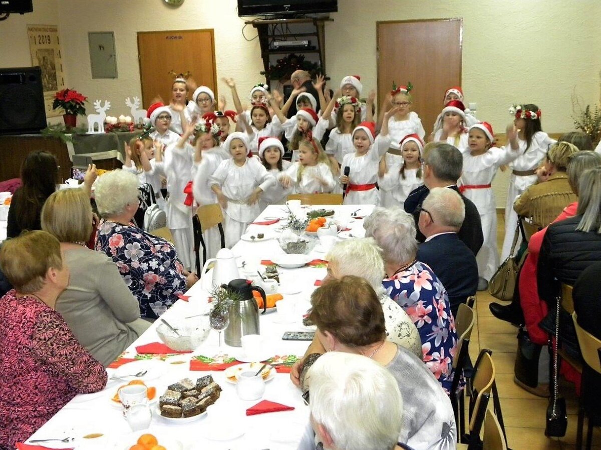 Życzenia wszystkim przybyłym złożyli: przewodnicząca Caritas Bernadetta Golomb, sekretarz gminy Ozimek Barbara Durkalec. radny powiatu opolskiego Antoni Gryc, sołtys Szczedrzyka, radny Rady Miejskiej Mirosław Wieszołek, przewodniczący Stowarzyszenia Przyjaciół Szczedrzyka Kazimierz Udolf oraz przewodniczący Koła DFK Klaus Leschik. Składając sobie świąteczno-noworoczne życzenia, dzielono się opłatkami pobłogosławionymi przez proboszcza parafii w Szczedrzyku ks. prałata Marcina Ogioldę. Ksiądz proboszcz z Marcinem Wilczkiem śpiewali też razem kolędy, a po wigilijnej wieczerzy odbył się koncert kolęd i piosenek bożonarodzeniowych w wykonaniu małych podopiecznych Stowarzyszenia „Akces” pod kierunkiem Elżbiety Pisuli-Bienieckiej. Spotkanie upłynęło w serdecznej atmosferze i było także okazją do wspólnych rozmów seniorów z parafii w Szczedrzyku.