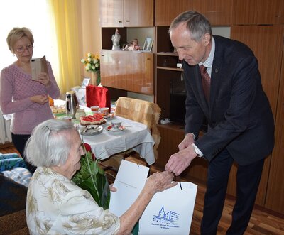 Pani Helena urodziła się w 1920 r. w Orenburgu (w ówczesnym ZSRR). Mimo, wielu lat cieszy się dobrym zdrowiem, czego dowiodła w rozmowie z Burmistrzem. Bardzo ucieszyła ją wizyta, a w szczególności, że mogła poznać także nowego burmistrza elekta.