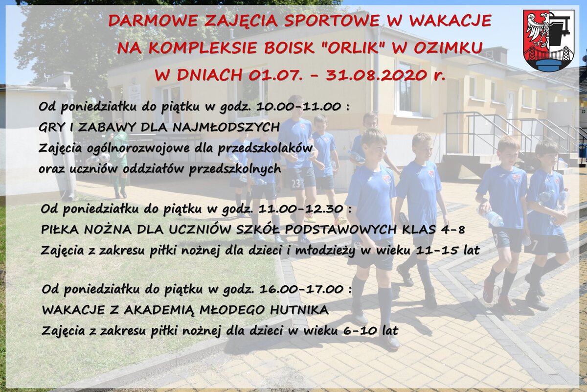 Informuję, iż od 01.07. do 31.08.2020 r. na kompleksie boisk sportowych ORLIK w Ozimku będą odbywać się darmowe zajęcia sportowe dla dzieci i młodzieży.