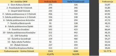 Informuję, iż frekwencja wyborcza podczas drugiej tury wyborów prezydenckich w Gminie Ozimek była wyższa niż w pierwszej turze i wyniosła 53,77 %.
