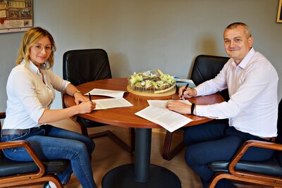 Burmistrz Ozimka Mirosław Wieszołek oraz Anna Krain – prokurent firmy Vianko Sp. z o.o. – głównego wykonawcy inwestycji dnia 2 sierpnia 2021 r. podpisali umowę na zadanie pn. „Przebudowa drogi gminnej ul. Dylakowskiej w miejscowości Biestrzynnik – etap I”.