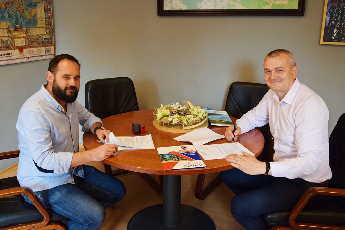 Burmistrz Ozimka Mirosław Wieszołek oraz Tomasz Pieńkowski – Członek Zarządu Lidera Konsorcjum firm - Lider: Probudowa.com Sp. z o.o. oraz Partner: IMD Paweł Wątroba – głównego wykonawcy inwestycji dnia 2 sierpnia 2021 r. podpisali umowę na zadanie pn. „Remont zabytkowego mostu w Ozimku”.