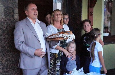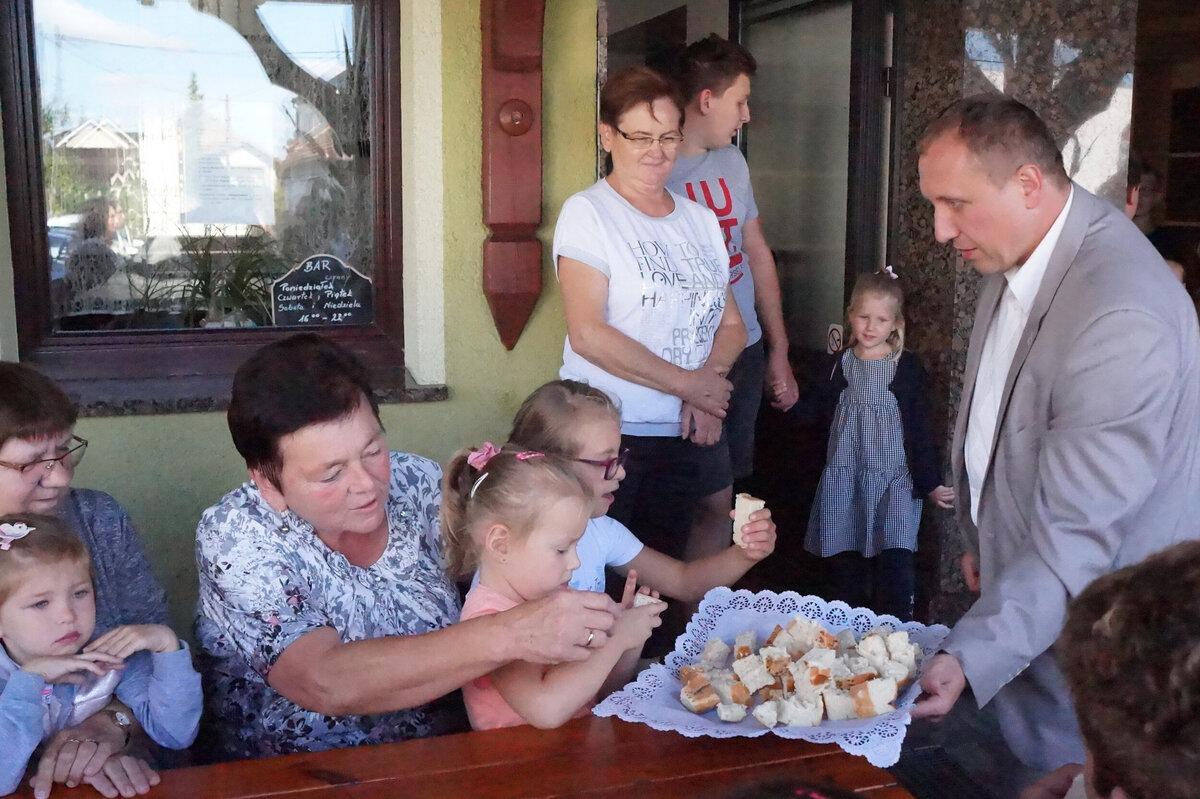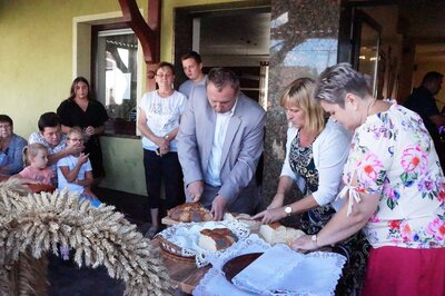 Po uroczystym przekazaniu chleba dożynkowego Zastępca Burmistrza Ozimka Andrzej Brzezina podzielił bochen wśród wszystkich zebranych.