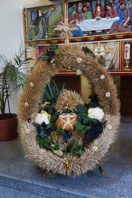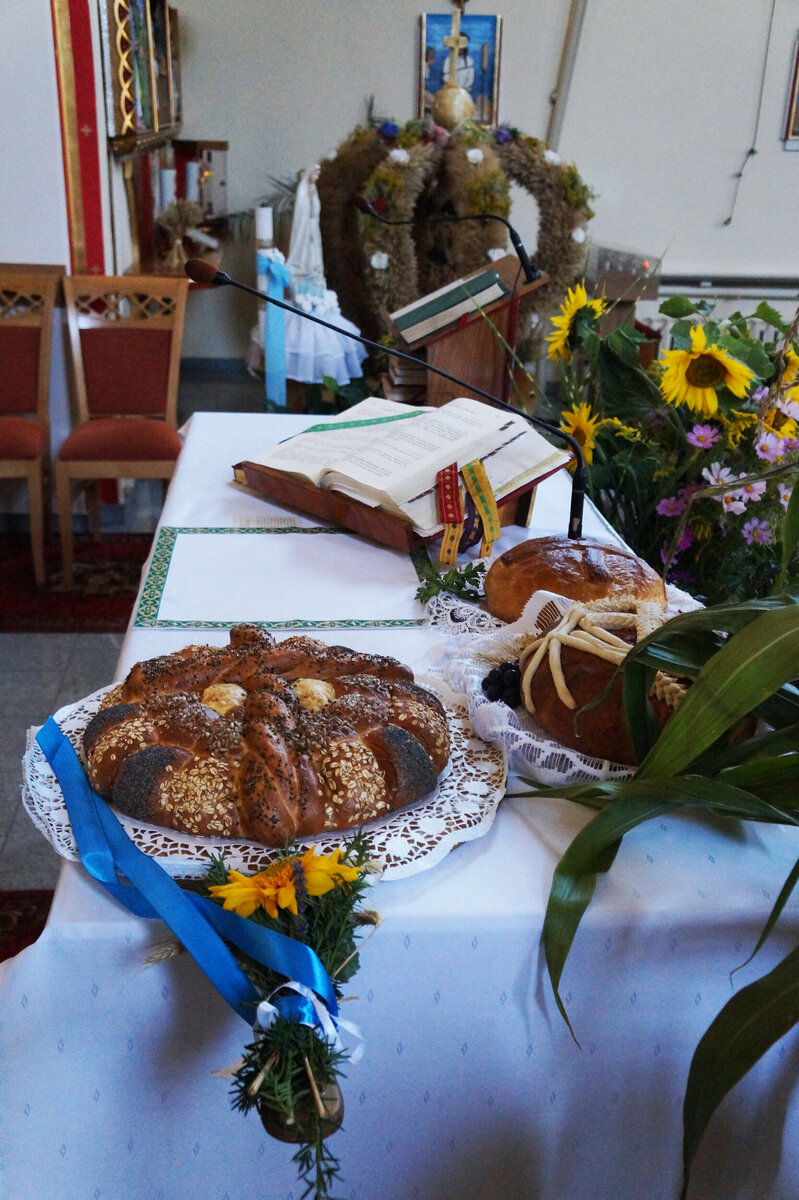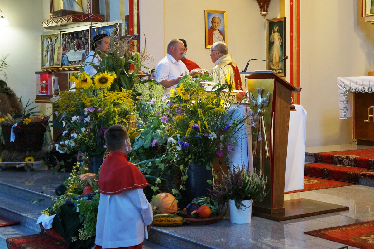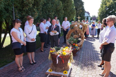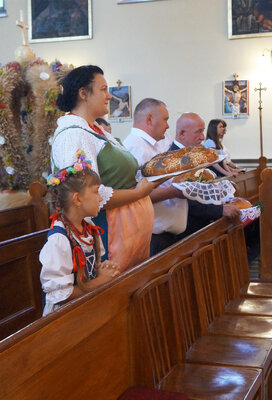 Mieszkańcy Grodźca, Chobia i Mnichusa świętowali tegoroczne plony podczas uroczystej Mszy św. dziękczynnej w, pięknie na tę okazję udekorowanym, kościele parafialnym. Gospodarze Dożynek przynieśli przed ołtarz chleb, aprzedstawiciele sołectw Chobie i Mnichus okazałe kosze i korony dożynkowe.