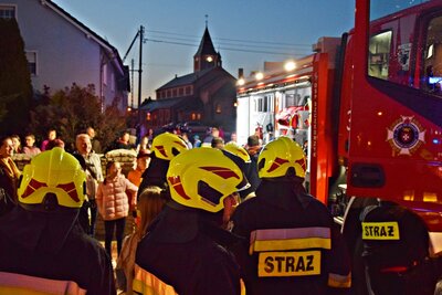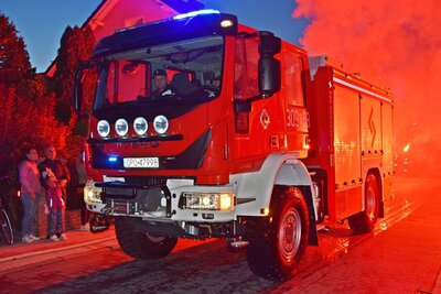 Samochód wjeżdżał do miejscowości na sygnałach w eskorcie obecnych dwóch pojazdów jednostki ze Szczedrzyka, bardzo efektownie przygotowane przywitanie – race, pirotechnika – uatrakcyjniło to wyjątkowe wydarzenie. Mieszkańcy witali nowy pojazd gromkimi brawami, a na ręce prezesa Andrzeja Jakubca składano liczne gratulacje.