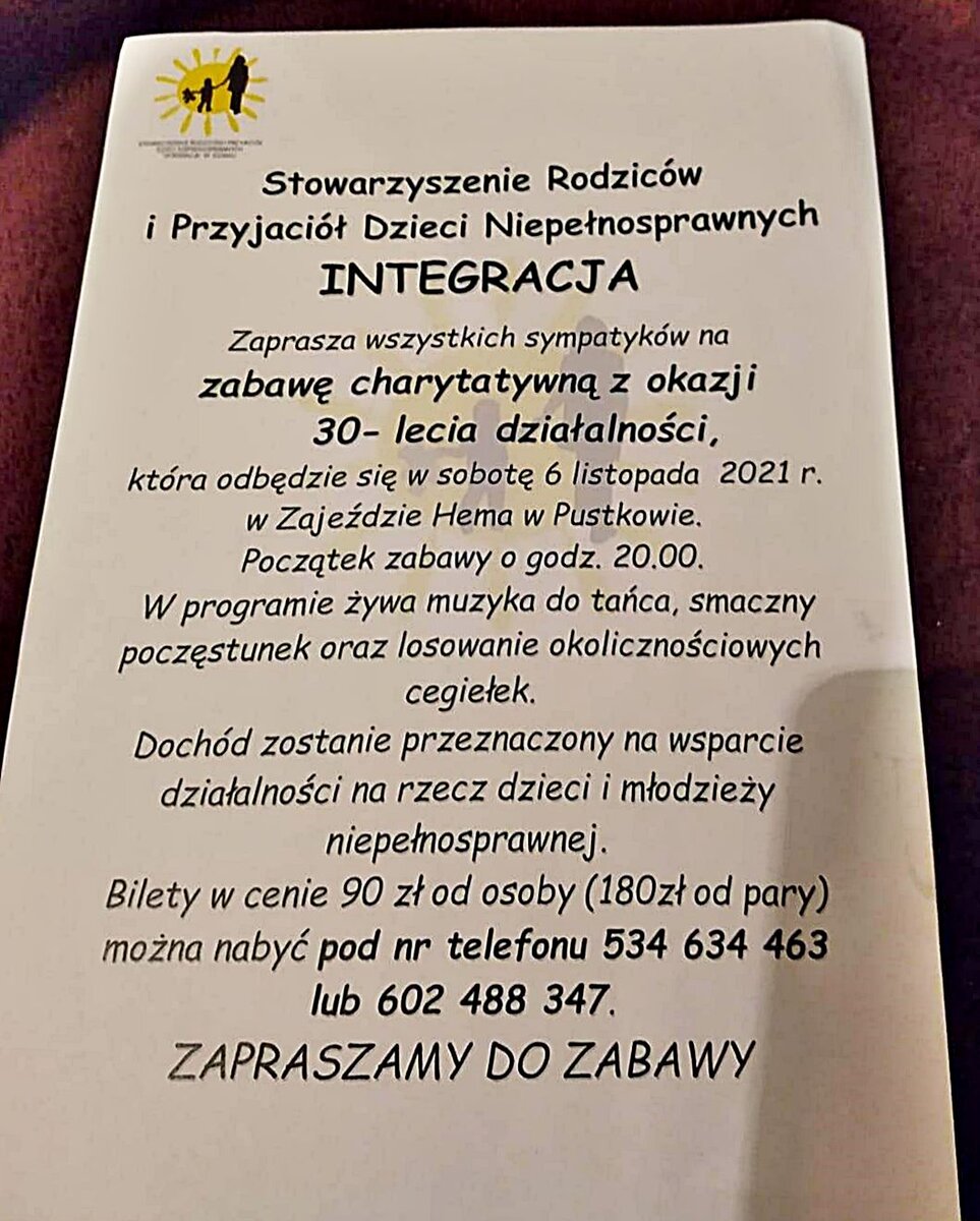 Stowarzyszenie INTEGRACJA z Ozimka zaprasza na imprezę charytatywną, która odbędzie się już 6 listopada 2021 r. w Zajeździe Hema w Pustkowie. Osoby zainteresowane są proszone o kontakt najpóźniej do 29 października 2021 r. (nr tel. 534 634 463 lub 602 488 347).