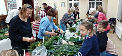 W piątkowy wieczór, dnia 17 grudnia 2021 r. w świetlicy starej szkoły spotkały się panie i rodziny z Krasiejowa, aby w atmosferze kolęd pod bacznym okiem florystki Katarzyny Sklorz tworzyć stroiki, które przyozdobią nasze świąteczne stoły.