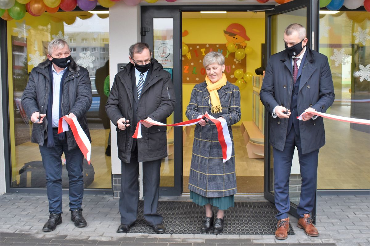Uroczystego przecięcia wstęgi dokonali: Burmistrz Ozimka Mirosław Wieszołek, Dyrektor Wydziału Polityki Społecznej Opolskiego Urzędu Wojewódzkiego Mieczysław Wojtaszek, Dyrektor Żłobka Samorządowego Małgorzata Fornalska oraz Prezes Zarządu Adamietz Sp. z o.o. Rajmund Adamietz – jako wykonawca inwestycji.