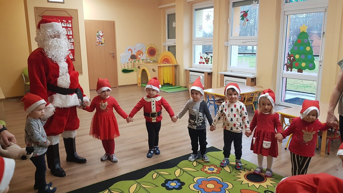 Mikołaj w Żłobku to szczególnie ważne wydarzenie dla wszystkich dzieci. Już pod koniec listopada Maluszki uczyły się piosenek i tańców by powitać upragnionego gościa. Od samego rana wyczekiwały Świętego nasłuchując radosnego okrzyku „hoł, hoł, hoł”. Aż w końcu rozległo się dźwięk dzwoneczka i w progu stanął ON…Święty Mikołaj. Miał czerwony strój, długą białą brodę, na nosie okulary i worek z prezentami.