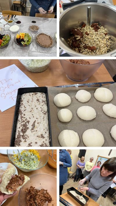 Na wstępie uczestniczki spotkania przywitały Sylwia Widawska - gospodarz wydarzenia oraz Karina Piontek - jego organizatorka. Panie, które przybyły na zajęcia nie spodziewały się tylu atrakcyjnych niespodzianek. Spotkanie zaczęło się od wspólnych rozmów integracyjnych przy kawie i cieście, przygotowanych przez panie Karinę i Beatę. A potem już tylko się działo - sprawnie, efektownie i smacznie. Planując przygotowanie potraw, Beata Kaczmarzyk musiała uwzględnić fakt, że świetlica wiejska nie dysponuje piekarnikiem. Ale udało się! Podzieleni losowo na grupy mieliśmy do wykonania różne zadania. Jedna z pań zajęła się przygotowaniem ciasta na bułki, inna na zdrowy chleb z ziarnami, kolejna pani przygotowała shaker truskawkowy. Potem przyszła kolej na pasty z kalafiora i brokułu, suszonych pomidorów i słonecznika oraz gulasz mięsny. Do przygotowania tych potraw wykorzystaliśmy wielofunkcyjne urządzenie kuchenne jakim jest thermomix. Przepisy zamieszczone były w specjalnie wydajnej na tę okazję karcie dań. Prowadząca objaśniała i wydawała polecenia w języku polskim i niemieckim, gdyż taki był wymóg tych zajęć.