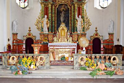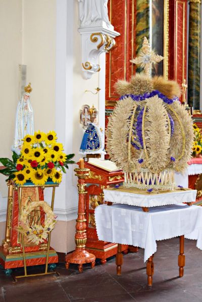 Dziękujemy Sołtysowi Wsi Krasiejów i jego żonie oraz siostrom zakonnym za pracę włożoną w piękne udekorowanie ołtarza i kościoła. Już przy wejściu na wchodzących oczekiwały bukiety słoneczników, a wzdłuż nawy głównej zawieszone były opisane woreczki ze źdźbłami zbóż zebranych z krasiejowskich pól oraz ustawione łodygi kukurydzy. Przed ołtarzem ustawiono liczne płody rolne i małe snopki, a przed balaskami zawieszono przyozdobione słomkowe wianuszki. Przy ołtarzu głównym można było podziwiać monstrancję wykonaną ze słomy. Dożynki parafialne w Krasiejowie zakończyły okres dożynkowy w Gminie Ozimek.