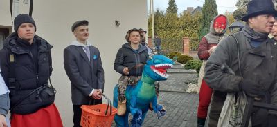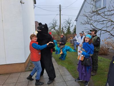 Następnie wsiedli na piękną podwodę, która wiozła ich na ulicę Brzeziny. Po drodze zatrzymywali samochody, udzielali upomnień (nawet policji) i wręczali mandaty. Obowiązkowo podczas odwiedzin gospodynie tańczyły z Berem, co zapewnić ma szczęście w przyszłości. Korowód był bardzo liczny i barwny. A w Krasiejowie, w odróżnieniu od innych wsi, do niedźwiedzia dołącza wspaniały dinozaur. I w końcu nie wiadomo, czy u nas chodzą Bery czy Dinozaur z niedźwiedziem. Grupie towarzyszyła głośna muzyka, przeróżne hałasy i okrzyki. Dziękujemy uczestnikom tradycyjnego wodzenia niedźwiedzia za odwiedziny, a mieszkańcom za datki, które mają szczytny cel - zakup nowego wozu strażackiego. Po południu w Starej Szkole dzieci mogły uczestniczyć w przygotowanych przez panią Ewę Kotysz animacjach, a wieczorem odbyła się zabawa taneczna dla dorosłych. Brawo strażacy z OSP Krasiejów z prezesem Tomaszem Chudalą na czele za przygotowanie tego wyjątkowego wydarzenia.