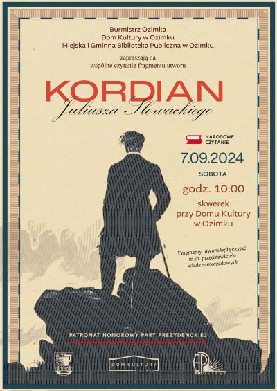 Zapraszamy mieszkańców gminy na Narodowe Czytanie „Kordiana” Juliusza Słowackiego, które odbędzie się w sobotę 7 września 2024 roku o godz. 10:00 na skwerku koło Domu Kultury w Ozimku. Wydarzenie organizowane jest w ramach 13. edycji ogólnopolskiej akcji pod Patronatem Honorowym Pary Prezydenckiej. Wybrane fragmenty I i II aktu sztuki, poświęcone dojrzewaniu Kordiana, odczyta Burmistrz Ozimka Mirosław Wieszołek oraz przedstawiciele Rady Miejskiej w Ozimku i Młodzieżowej Rady Miejskiej.