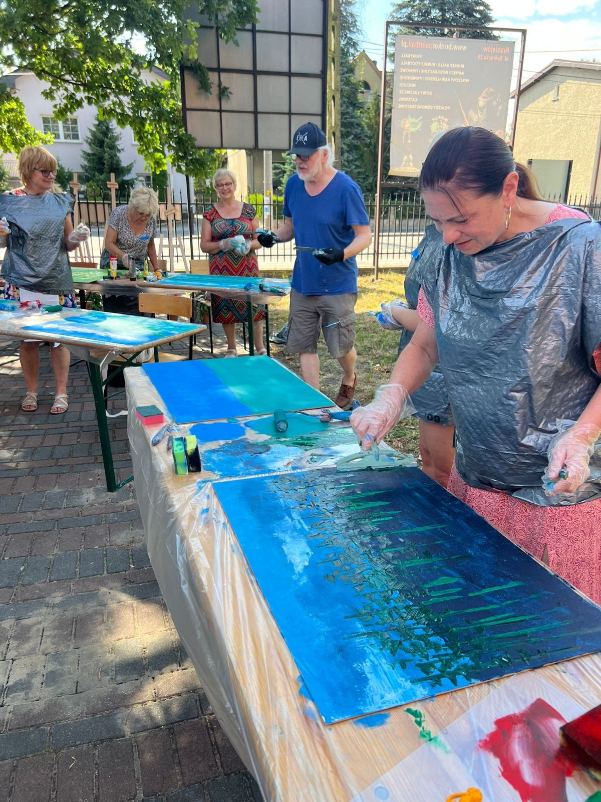 Podzieliłyśmy się na dwie grupy, jedne panie malowały barwne kwiaty nawiązując do pięknej pogody i barw lata, a inne, kierując się sugestią Pana Romana malowały elementy marynistyczne marząc o wypoczynku nad morzem. Na obrazach mieszały się odcienie zieleni, turkusu rozświetlone białą barwą falującego morza czy chmur na niebie, a czasami żaglówki kołyszącej się na wodzie.