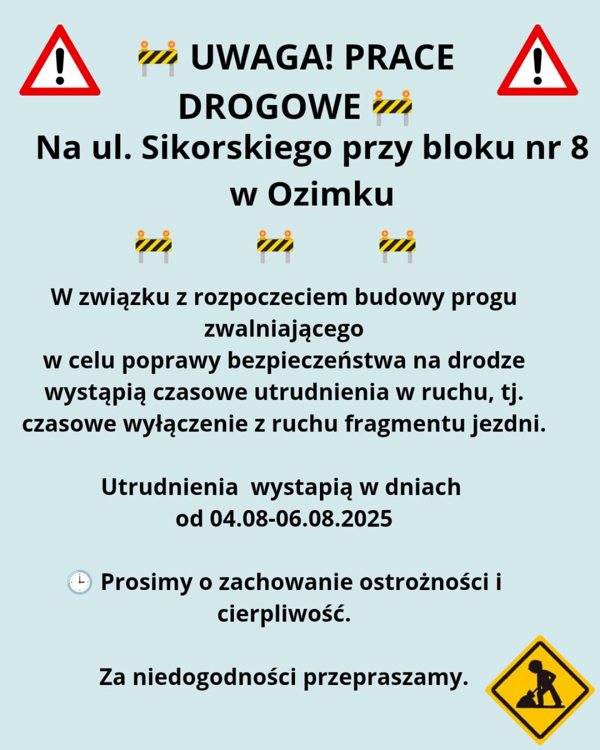UWAGA! Prace drogowe na ul. Sikorskiego (przy bloku nr 8) w Ozimku