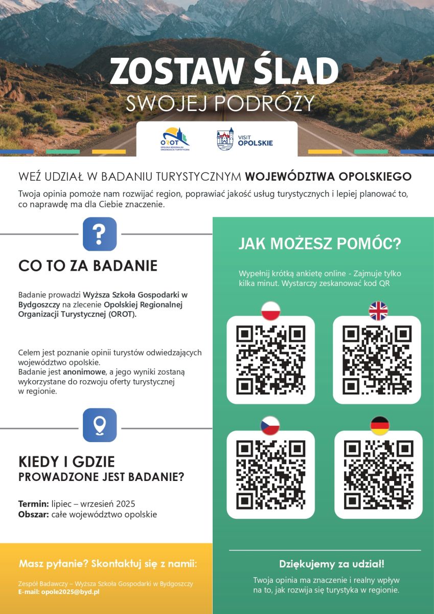 Opolska Regionalna Organizacja Turystyczna zwraca się z prośbą do mieszkańców zwiedzających nasz region oraz turystów odwiedzających województwo opolskie o wypełnienie krótkiej, anonimowej ankiety. Badanie ma na celu ocenę atrakcyjności turystycznej województwa.