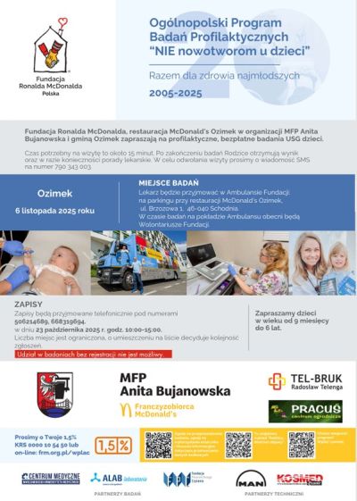 Urząd Gminy i Miasta w Ozimku wraz z Fundacją Ronalda McDonalda i Restauracją McDonald’s w Schodni zaprasza rodziców z dziećmi w wieku od 9 miesięcy do 6 lat na bezpłatne badania profilaktyczne USG jamy brzusznej.