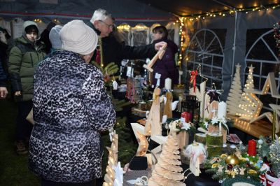 Na całym placu oraz wokół namiotu imprezowego ustawione były liczne stoiska z przekąskami, ciastami i różnymi produktami spożywczymi oferowanymi przez lokalnych wytwórców, a także z rękodziełem artystycznym nawiązującym do tradycji Świąt Bożego Narodzenia.