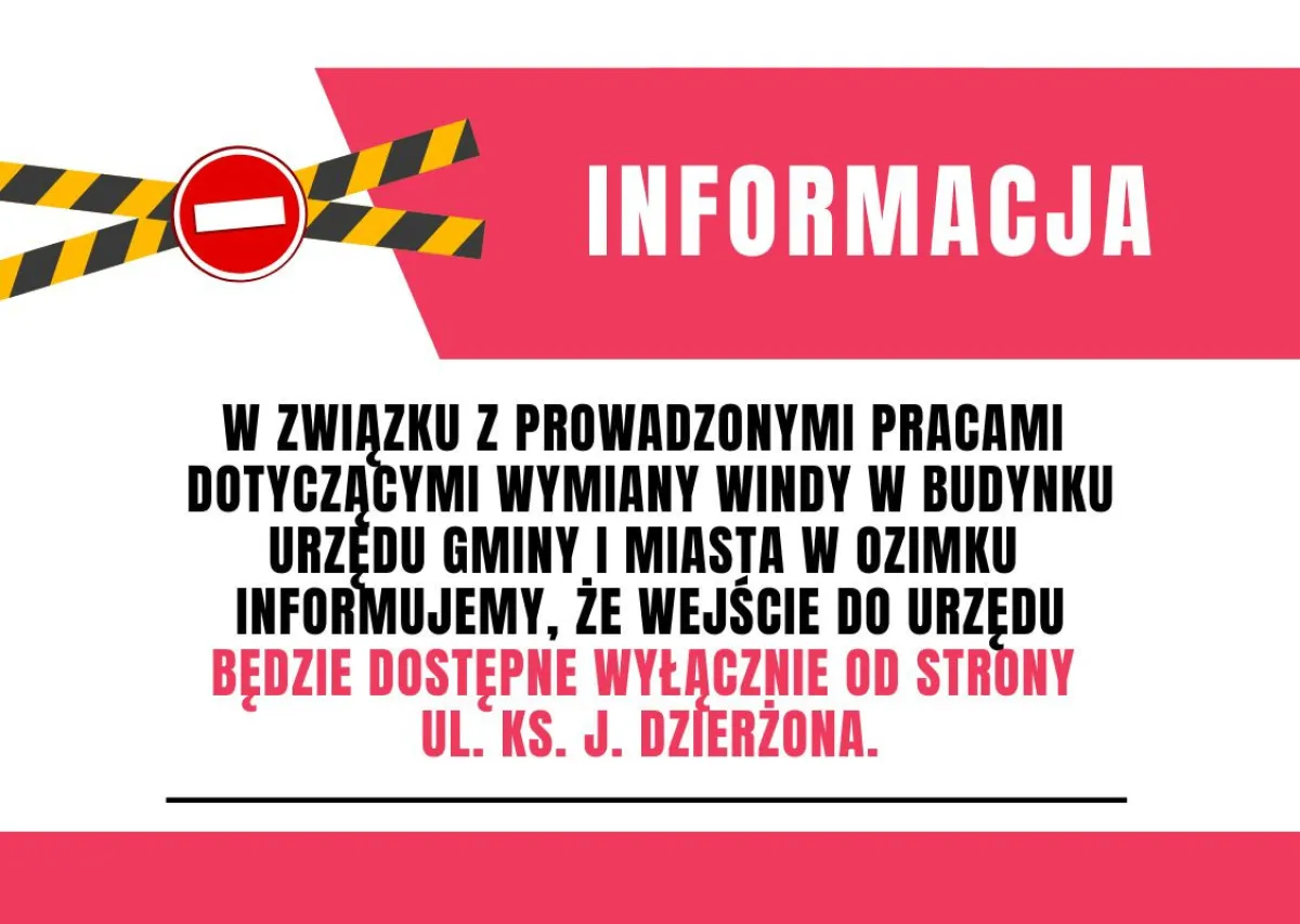 W związku z prowadzonymi pracami dotyczącymi wymiany windy w budynku Urzędu Gminy i Miasta w Ozimku informujemy, że wejście do Urzędu będzie dostępne wyłącznie od strony ul. ks. J. Dzierżona.