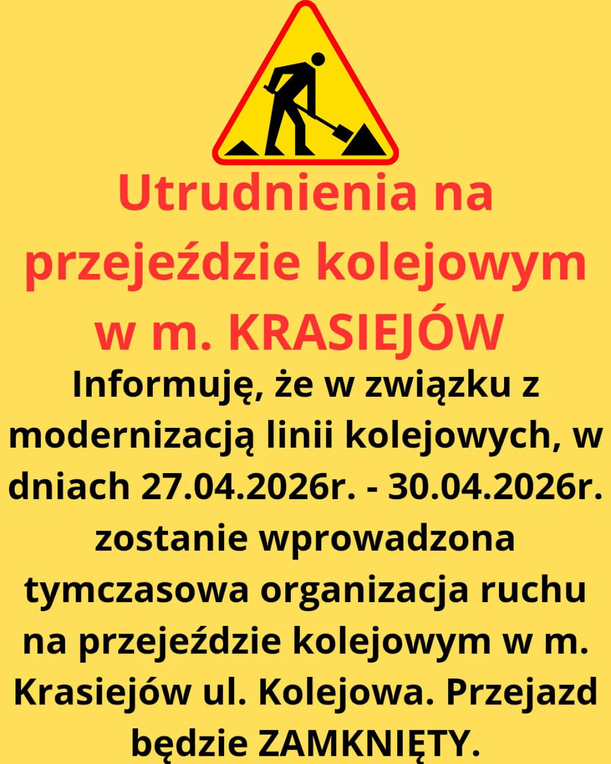 Informuję, że w związku z modernizacją linii kolejowych, w dniach od 27.04.2026r. do 30.04.2026r. zostanie wprowadzona tymczasowa organizacja ruchu ma przejździe kolejowym w m. Krasiejów ul. Kolejowa. Przejazd będzie ZAMKNIĘTY.