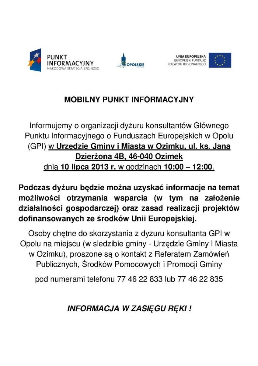Osoby chętne do skorzystania z dyżuru konsultanta GPI w Opolu na miejscu (w siedzibie gminy - Urzędzie Gminy i Miasta w Ozimku), proszone są o kontakt z Referatem Zamówień Publicznych, Środków Pomocowych i Promocji Gminy