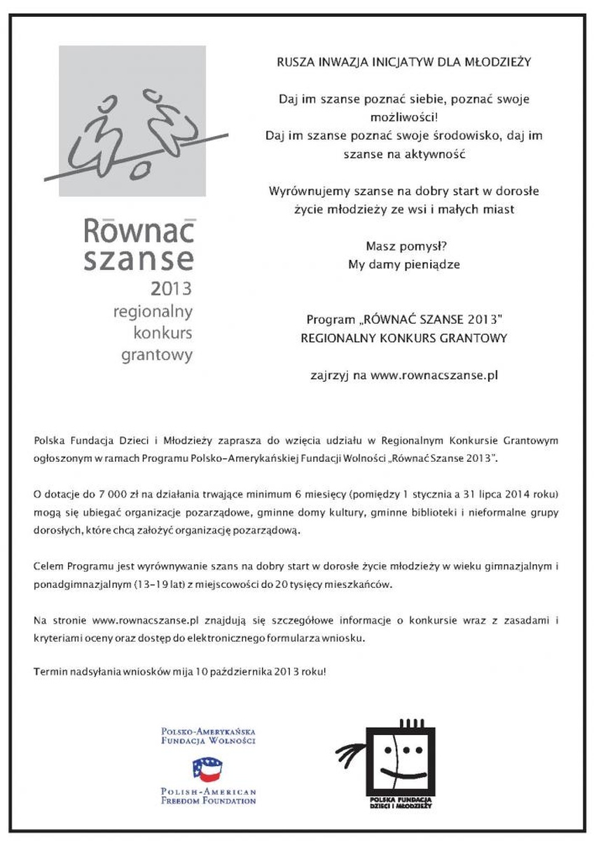 Polska Fundacja Dzieci i Młodzieży ogłasza kolejną edycję Regionalnego Konkursu Grantowego w ramach Programu „Równać Szanse 2013” Polsko-Amerykańskiej Fundacji Wolności.