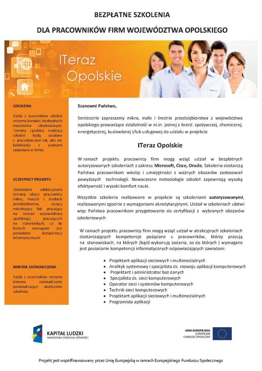 W ramach projektu pracownicy firm mogą wziąć udział w bezpłatnych autoryzowanych szkoleniach z zakresu Microsoft, Cisco, Oracle Szkolenia dostarczą Państwa pracownikom wiedzy i umiejętności z ważnych obszarów zastosowań powyższych technologii. Nowoczesne metodologie szkoleń zapewniają wysoką efektywność i wysoki komfort nauki.