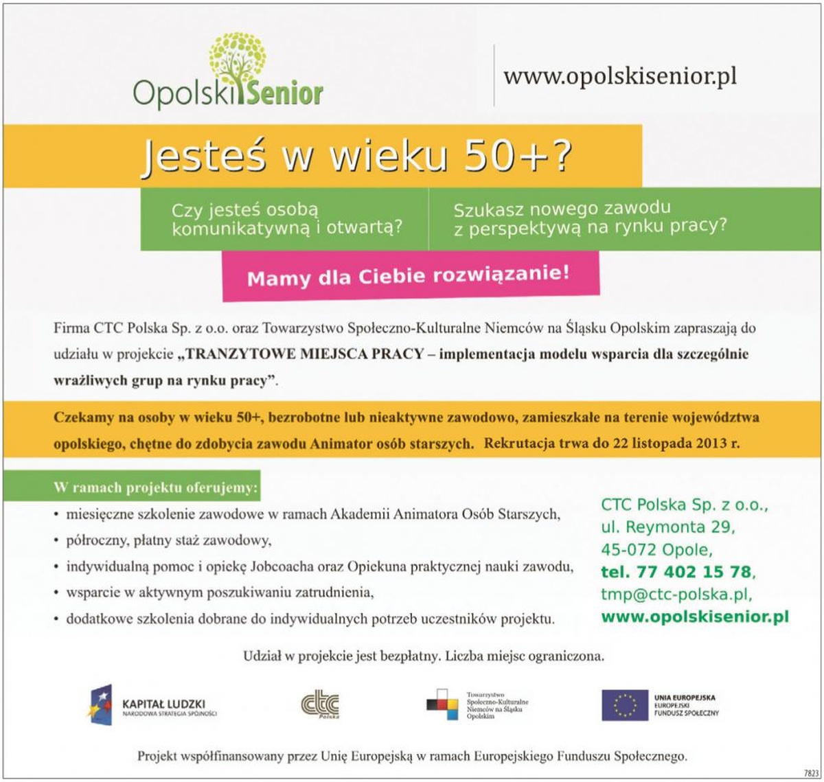 Towarzystwo Społeczno-Kulturalne Niemców na Śląsku Opolskim oraz firma CTC Polska Sp. z o. o. zapraszają do udziału w projekcie „TRANZYTOWE MIEJSCA PRACY – implementacja modelu wsparcia dla szczególnie wrażliwych grup na rynku pracy”. Czekamy na osoby w wieku 50+, bezrobotne lub nieaktywne zawodowo, zamieszkałe na terenie województwa opolskiego, chętne do zdobycia zawodu Animator Osób Starszych.