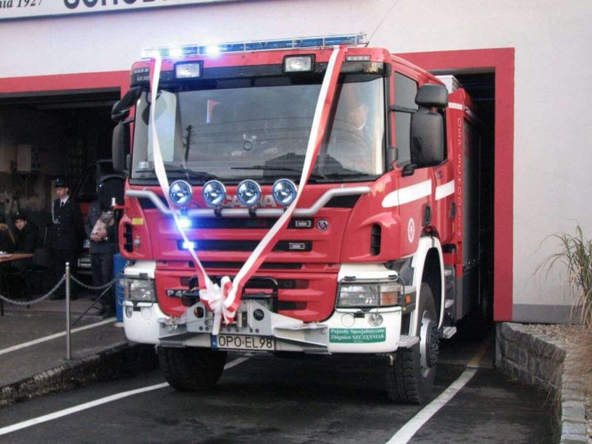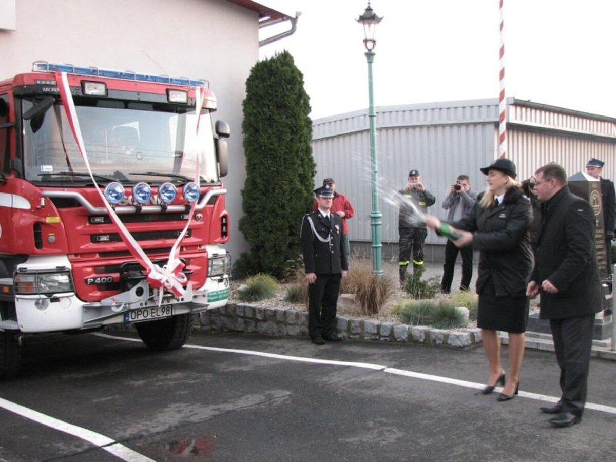 Nowy samochód to SCANIA GCBA 5/32, której wartość wraz z wyposażeniem wynosi około 900 tys. zł. Zakupu dokonano przy finansowym wparciu Gminy Ozimek (dotacja wynosiła ponad 300 tyś. zł), Zarządu Głównego OSP RP, Komendy Wojewódzkiej PSP w Opolu, Ministerstwa Spraw Wewnętrznych oraz środków własnych OSP Schodnia. Samochód został zbudowany w firmie Szcześniak w Bielsku-Białej, specjalizującej się w budowie samochodów specjalnych. W uroczystości przekazania samochodu uczestniczyli liczni goście, na czele z wiceministrem spraw wewnętrznych Stanisławem Rakoczym, komendantem wojewódzkim Państwowej Straży Pożarnej w Opolu nadbrygadierem Karolem Stępniem, wiceprezes Zarządu Głównego Związku OSP RP Teresą Tiszbierek, przedstawicielami władz województwa, powiatu opolskiego i gminy Ozimek – z burmistrzem Markiem Korniakiem i przewodniczącym Rady Miejskiej Joachimem Wiesbachem. Obecne też były delegacje z pocztami sztandarowymi jednostek OSP naszej gminy oraz zaprzyjaźnionej jednostki strażackiej z Ryżoviste w Czechach. Akt przekazania samochodu, wraz z kluczykami i dokumentami, odebrał prezes OSP Schodnia Marek Elis. Po poświęceniu samochodu przez uczestniczących w ceremonii księży, odbyły się jego „chrzciny”. Rodzicami chrzestnymi nowego wozu strażackiego zostali Marek Korniak i Teresa Tiszbierek. W przemówieniach wszyscy życzyli strażakom ze Schodni, by nowy samochód służył im długo i dobrze. OSP Schodnia wraz z jednostkami z Krasiejowa oraz Szczedrzyka, należy do Krajowego Systemu Ratowniczo-Gaśniczego, a więc od jej wyposażenia oraz sprawności w dużym stopniu zależy bezpieczeństwo mieszkańców naszej gminy.