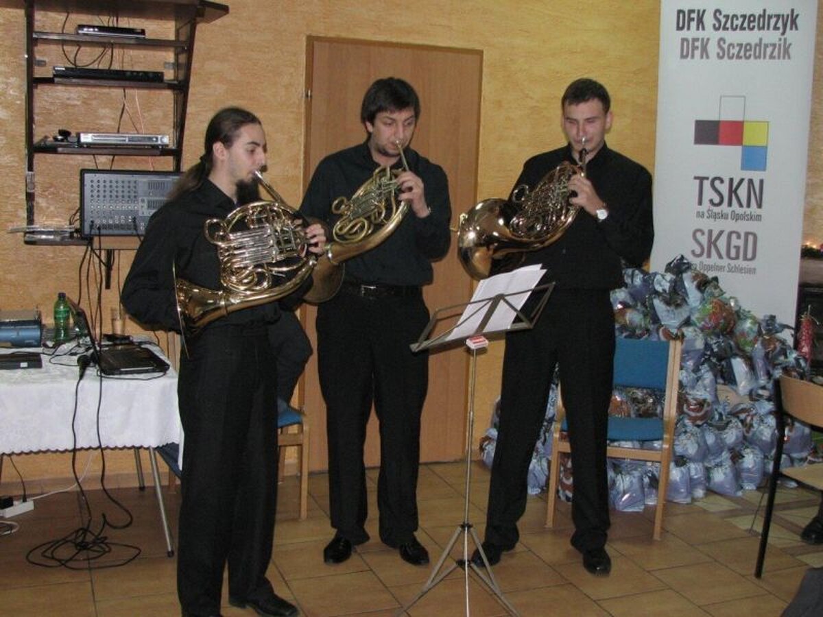 Wystąpił w niej Robert Bartocha i jego przyjaciele z Katowic, solistka Julia Ledwoch ze Szczedrzyka – laureatka pierwszego miejsca na Festiwalu Piosenki Niemieckiej „SuperStar 2013” w Krapkowicach, solista Swen Solisch ze Strzeleczek – zdobywca trzeciego miejsca na tymże konkursie oraz DJ Mateusz Rzepka. W trakcie spotkania na salę przyszedł święty Mikołaj, który paczkami ze słodyczami obdarował wszystkie dzieci oraz członków DFK w wieku powyżej 75. lat. Świąteczno-noworoczne życzenia złożyli: przewodniczący DFK Klaus Leschik i przewodniczący RM Joachim Wiesbach, po czym wszyscy zasiedli do posiłku i wspólnego śpiewania kolęd, przy których, w serdecznej atmosferze, upłynęło to adwentowe spotkanie.