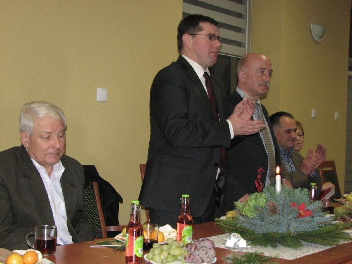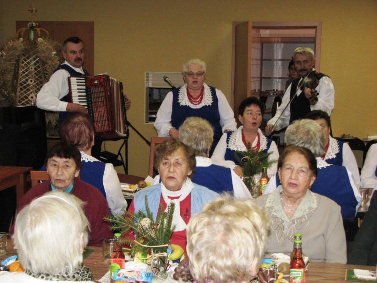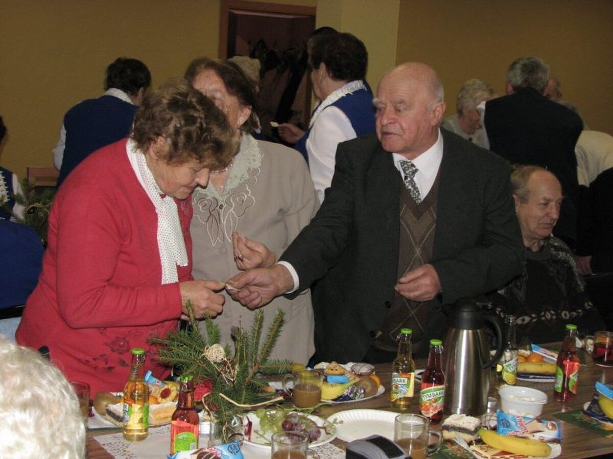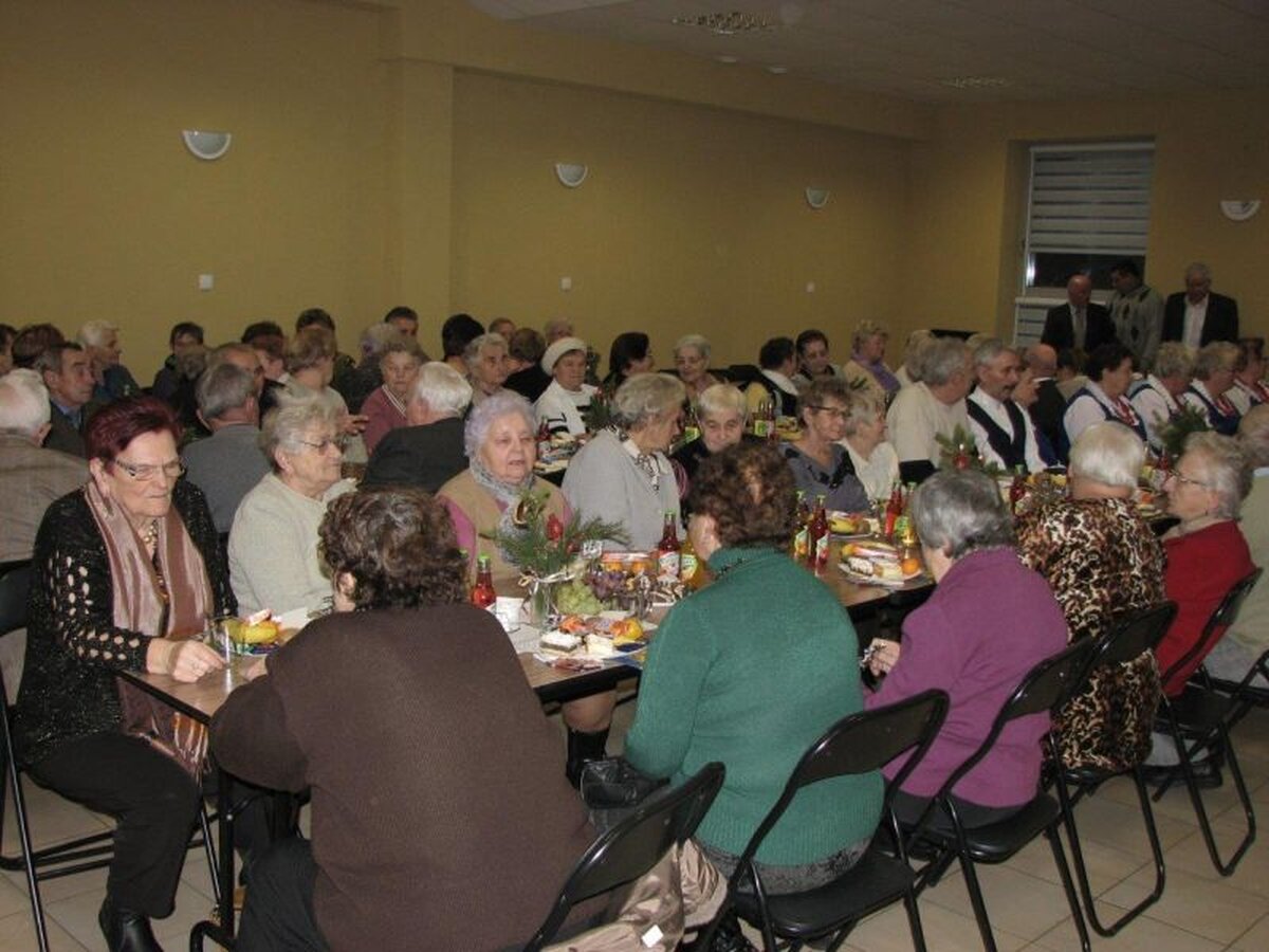 Przy poczęstunku kawą, ciastem, owocami i słodyczami uczestnicy spotkania wysłuchali pierwszej części kolędowego koncertu, po czym świąteczno-noworoczne życzenia złożyli im: sołtys Zdzisław Adamski, burmistrz Ozimka Marek Korniak i przewodnicząca parafialnego zespołu Caritas Teresa Kałamarz. Dzieląc się świątecznym opłatkiem, nawzajem składano sobie życzenia zdrowia i wszelkiej pomyślności. Po złożonych życzeniach, wszyscy zasiedli do tradycyjnego wigilijnego posiłku: smażonej ryby z ziemniakami i kapustą. Na zakończenie swój bogaty świąteczny repertuar powtórnie zaprezentował zespół „Grodziec”, wraz z którym obecni na sali seniorzy śpiewali kolędy i wspominali czasy swojego dzieciństwa – Święta Bożego Narodzenia spędzane na Kresach Wschodnich.