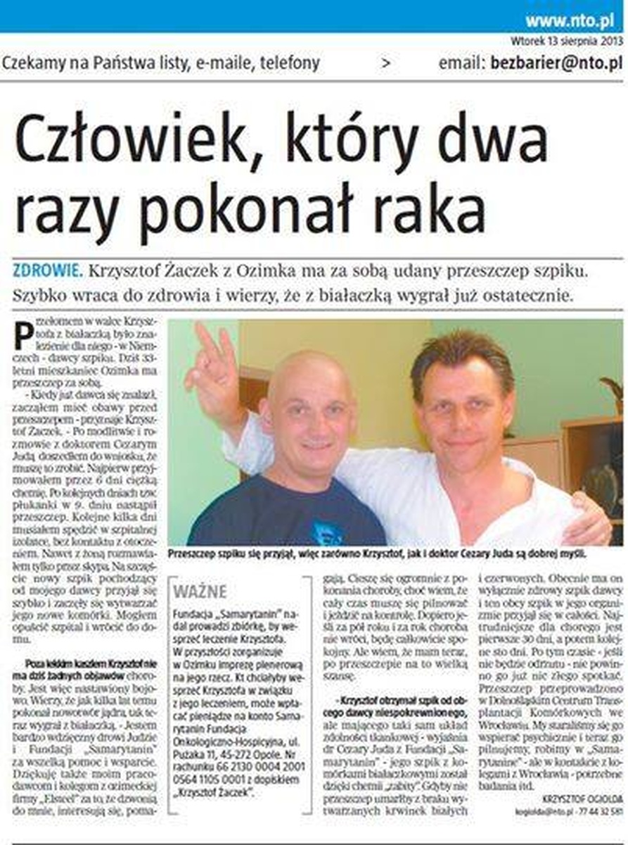 Pół roku po przeszczepie szpiku choroba powróciła. W tej chwili jest potrzebna krew. Wystarczy w punkcie krwiodawstwa podać 'dla Krzysztofa Żaczka'. Trzymajmy kciuki i pomóżmy Krzyśkowi - by wygrał po raz 3-ci!