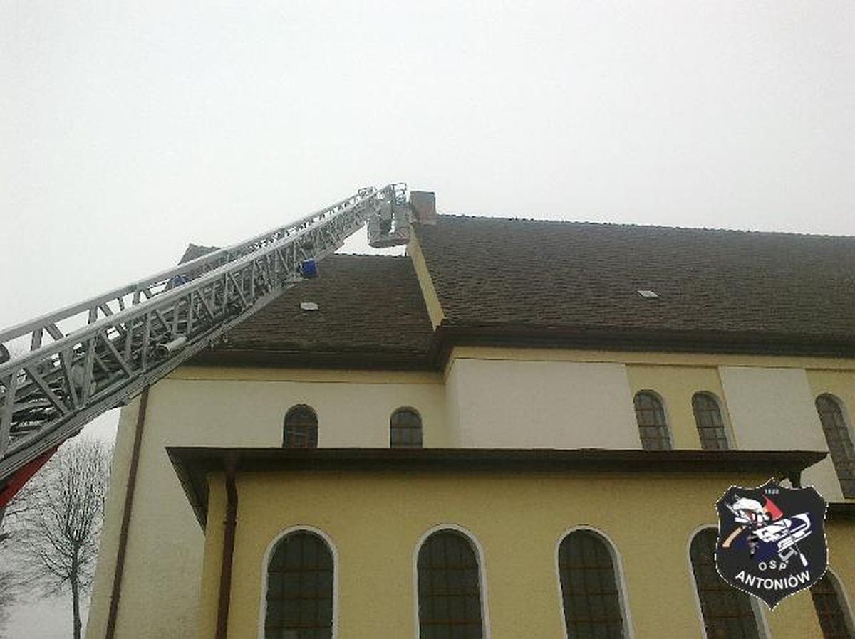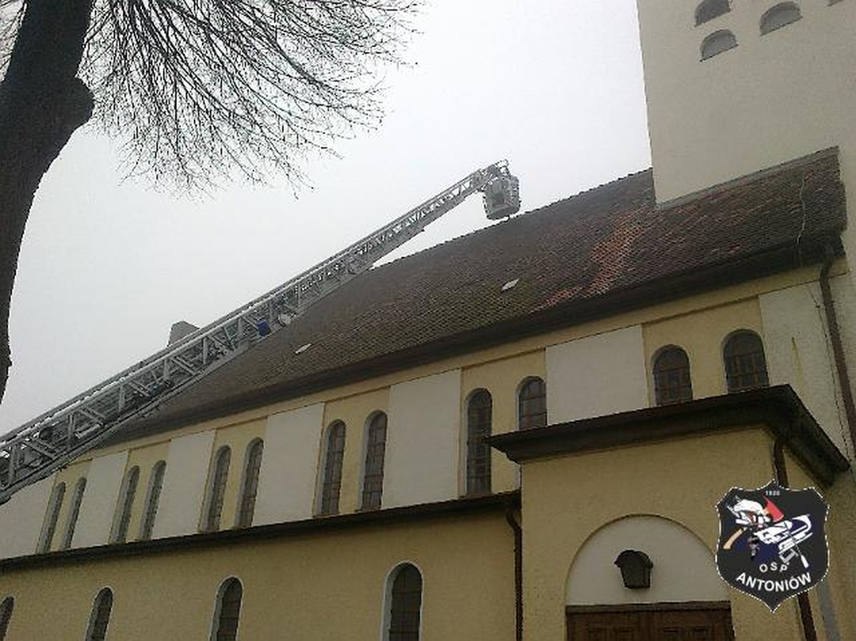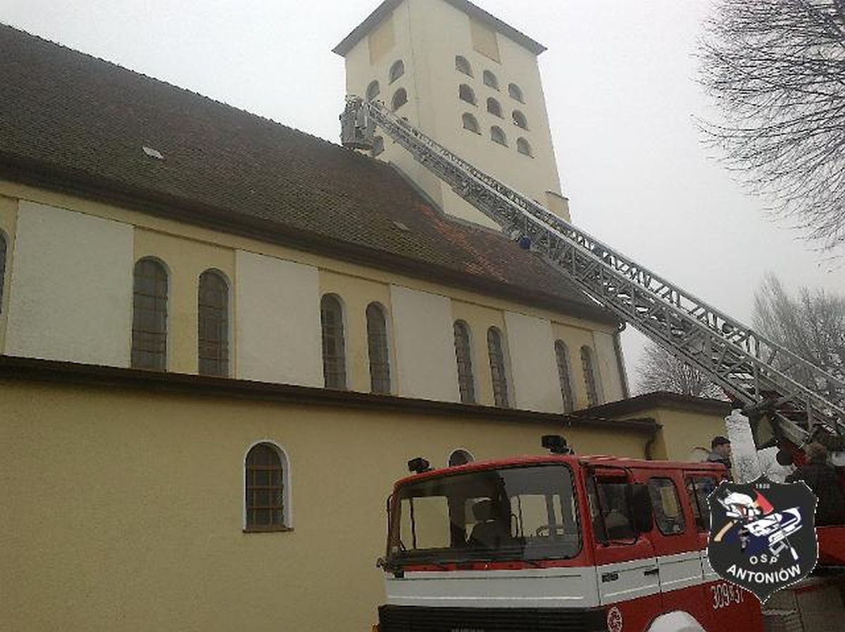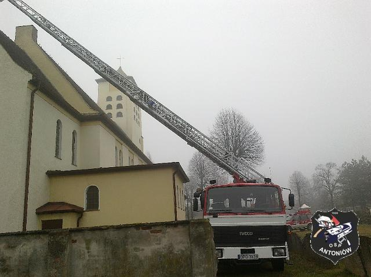 Po ostatnich między świątecznych wichurach, zerwanych zostało kilkanaście gąsiorów dachowych kościoła. Dzięki pomocy Prezesa OSP Schodnia Marka Elisa, który udostępnił drabinę jego jednostki, można było sprawnie przeprowadzić szybki remont, osadzając uszkodzone gąsiory na zaprawie. Paweł oraz Grzegorz z OSP Antoniów poradzili sobie z problemem bardzo fachowo. Kościół ma dla strażaków z Antoniowa bardzo duże znaczenie i pewną ikoną, gdyż większość mieszkańców ich miejscowości zostało w nim ochrzczonych oraz przystąpiło do Pierwszej Komunii Św.
