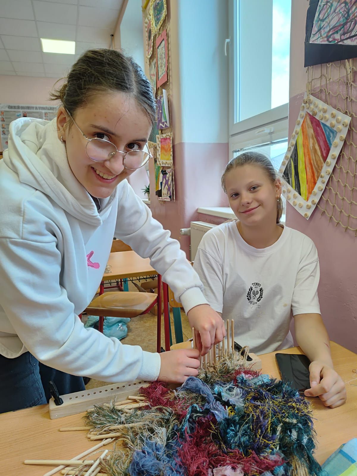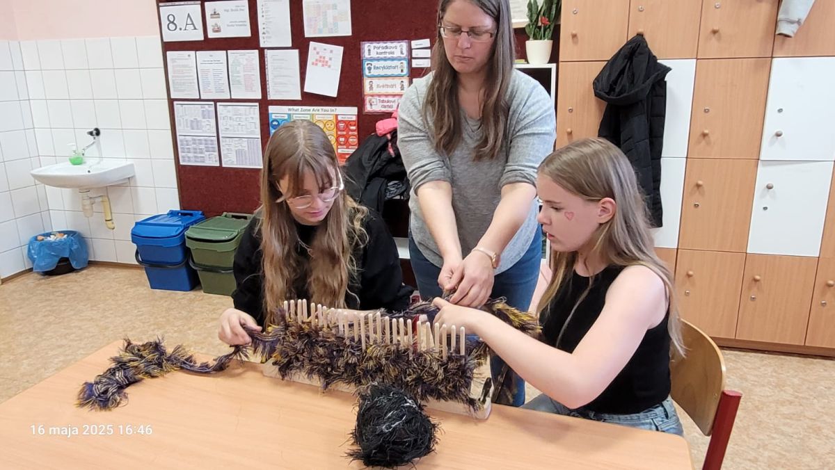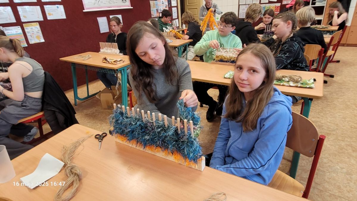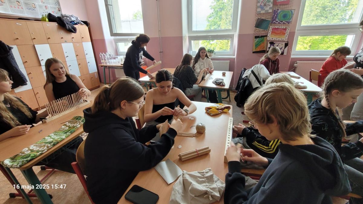 Po niezwykle serdecznym przywitaniu z czeskimi kolegami i ich opiekunami udaliśmy się do gmachu szkoły, gdzie miały miejsce warsztaty tkania szypułkowego, podczas których poznawaliśmy tradycyjną technikę tkacką polegająca na tworzeniu tkanin z cienkich, splecionych ze sobą pasemek materiału, zwanych szypułkami. Tym samym w parach polsko-czeskich rozpoczęliśmy pierwszy etap tworzenia poduszeczek. Starannie dobieraliśmy kolory, które również podkreślały charakter naszego wyrobu i osobowość jego twórców. Ten pełen emocji dzień zakończył wspólny wieczór przy grach planszowych, który stał się okazją do wspaniałej zabawy i integracji uczestników projektu.