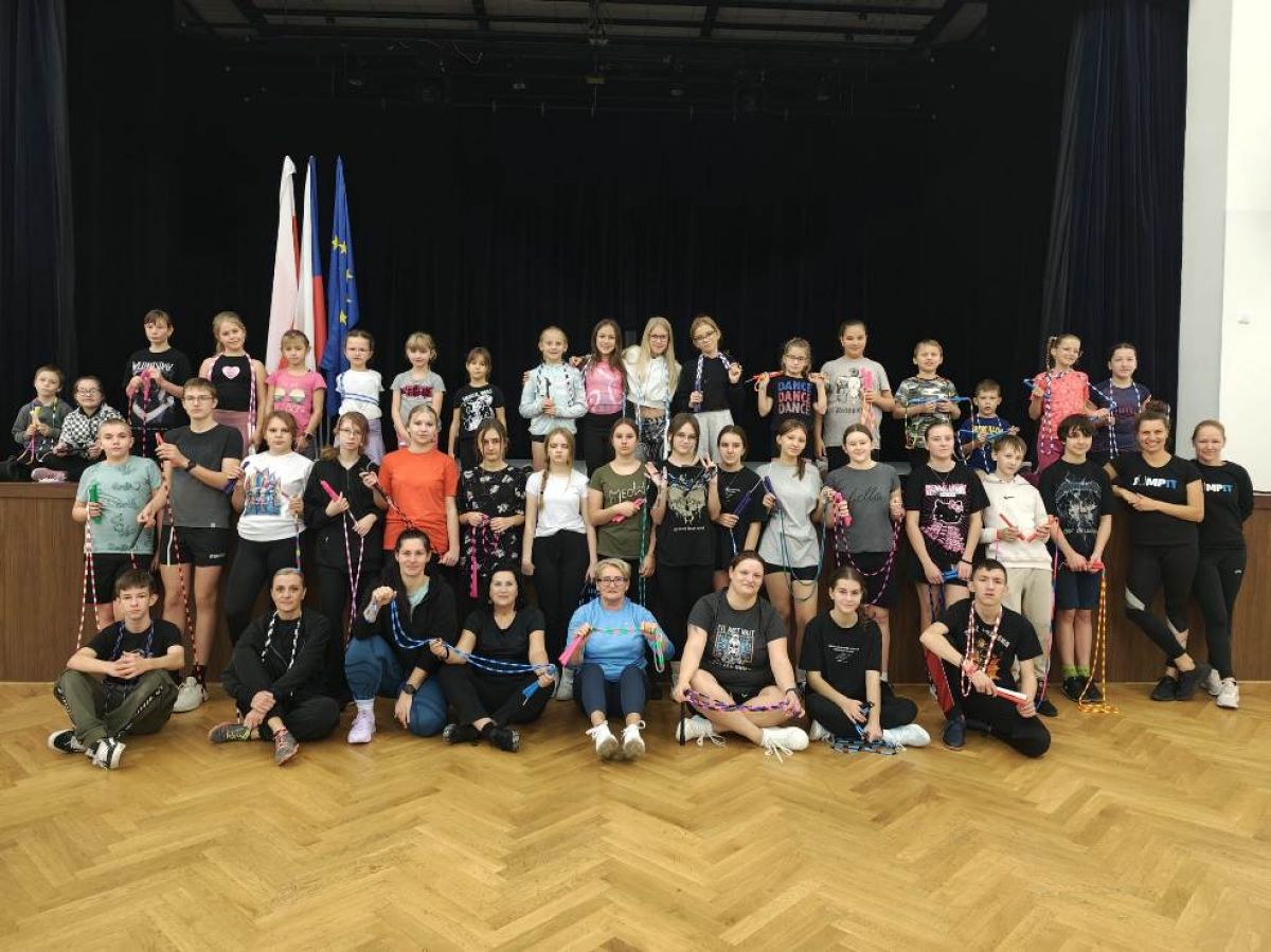 Bardzo zmęczeni, ale zadowoleni, wróciliśmy na nocleg, by po (nie)przespanej nocy powrócić do Střediska volného času, gdzie się odbywały nasze spotkania z czeskimi dziećmi, które także uczestniczyły w projekcie. A czekały na nas nie lada wyzwania - warsztaty ze skakania na skakance. I wydawałoby się, że to nic takiego, że na skakance, to skakać potrafi każdy, ale nie ma nic bardziej mylnego. Na nasze warsztaty przyjechały instruktorki z Pragi. My nie wiedzieliśmy, że na skakance można skakać na tyle przeróżnych sposobów i możliwości. Zaczęliśmy od ... zrobienia skakanek. Z maleńkich, różnokolorowych kawałków plastiku, dwóch rączek i kawałka sznurka, wyszły nam prawdziwe arcydzieła. Każda skakanka była inna, ale za to zrobiona na miarę dla jej właściciela. Cudowną niespodzianką była informacja, że skakanki otrzymujemy na własność i możemy je zabrać do domu! Ale nie tylko skoki na skakance były zaplanowane tego dnia. Była także uspokajająca joga i trening funkcjonalny. Graliśmy też w Kinball, czyli piłką Kin, wielką szarą kulą, była to świetna zabawa pod opieką pani Andrea Továrková. Po obiedzie uczyliśmy się tańczyć. Nasza przesympatyczna opiekunka- instruktorka SVC , pani Lucie Laštůvková, z niespożytą energią, ogromną cierpliwością oraz wesołym uśmiechem nauczyła nas "street dance". Krok po kroku nauczyliśmy się tych ruchów, które przydały się wieczorem, gdyż... Gdyż wieczorem była dyskoteka! Wszyscy byliśmy ubrani w czarne stroje, które zostały przyozdobione świecącymi pałeczkami led według indywidualnej inwencji każdego uczestnika. Kiedy w sali tanecznej zgasło światło, fluorescencyjne dekoracje robiły wspaniałe wrażenie, szczególnie kiedy tańczyliśmy popularną "Belgijkę". Nie chciało się iść spać.