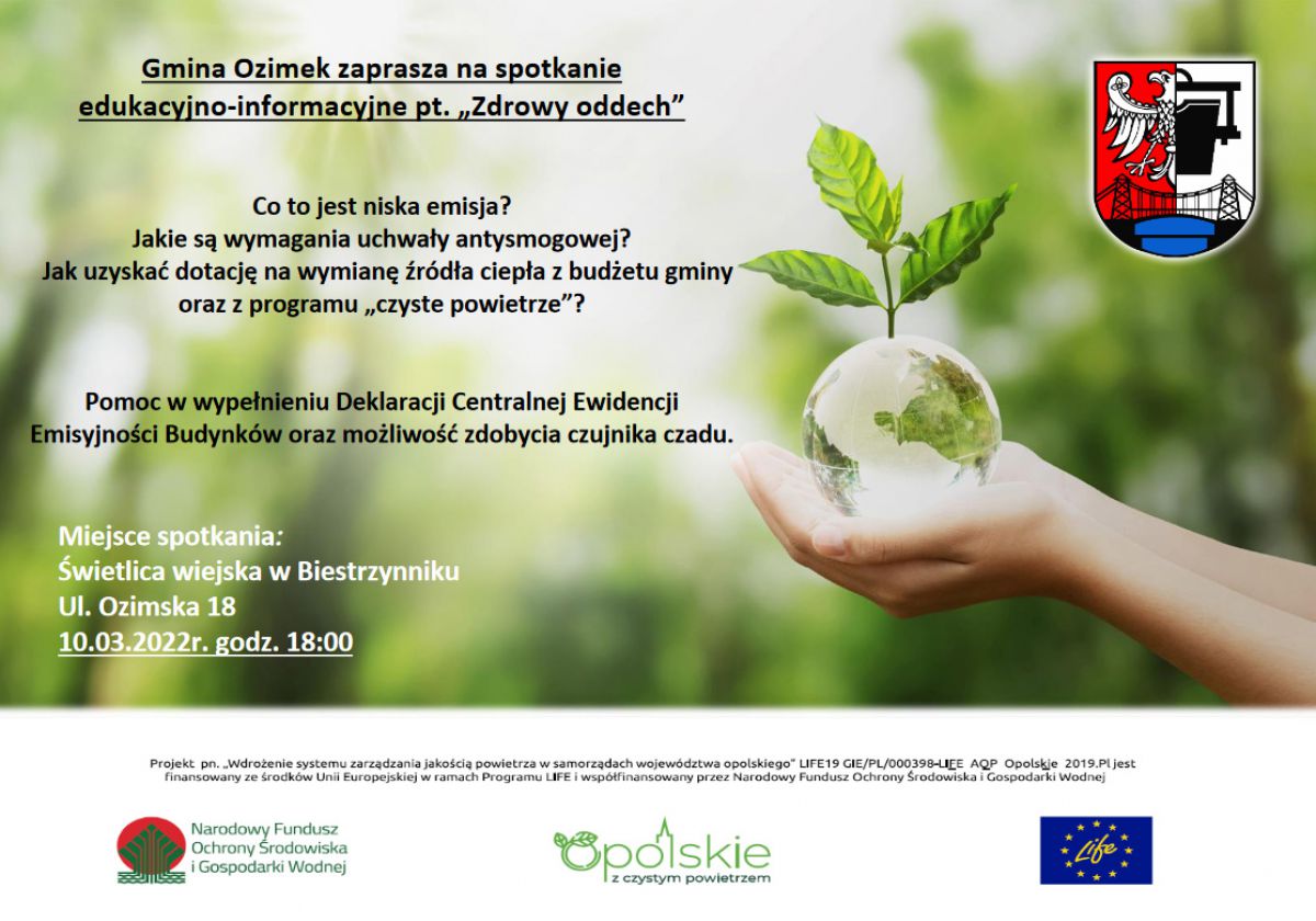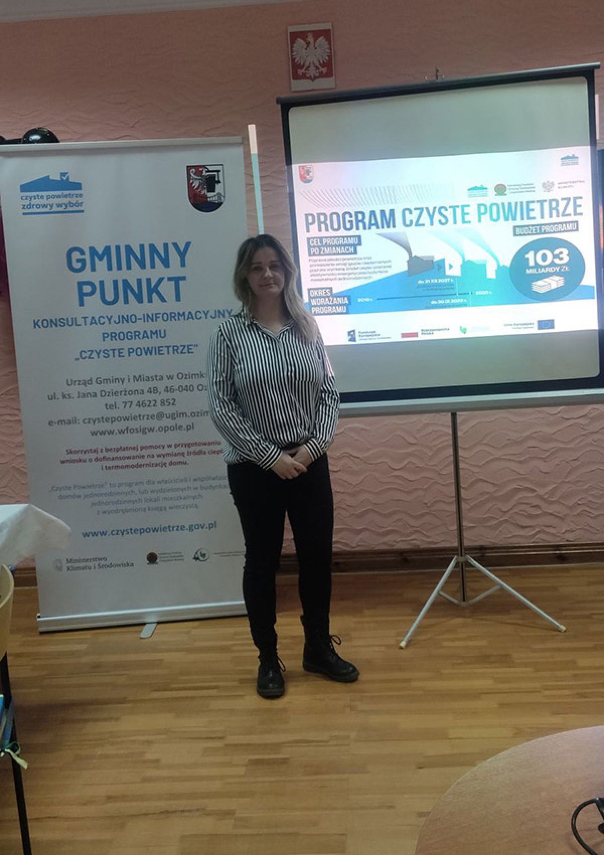 Mieszkańcy Mnichusa w czwartek 3 marca br. zebrali się w świetlicy wiejskiej w Mnichusie na spotkaniu, gdzie wysłuchali prezentacji w ramach projektu LIFE "Wdrożenie systemu zarządzania jakością powietrza w samorządach województwa opolskiego", który jest finansowany ze środków Unii Europejskiej w ramach Programów LIFE i współfinansowany przez Narodowy Fundusz Ochrony Środowiska i Gospodarki Wodnej. Podczas prezentacji zostały przedstawione informacje na temat projektu LIFE, niskiej emisji, wpływie zanieczyszczeń powietrza na nasze zdrowie oraz możliwości ograniczenia ich emisji. Przedstawiono możliwości uzyskania dofinansowania do wymiany kotła z Budżetu Gminy Ozimek. W ramach realizacji porozumienia dotyczącego realizacji programu "czyste powietrze" została przestawiona prezentacja dotycząca możliwości otrzymania dofinansowania z Wojewódzkiego Funduszu Ochrony Środowiska i Gospodarki Wodnej w Opolu.