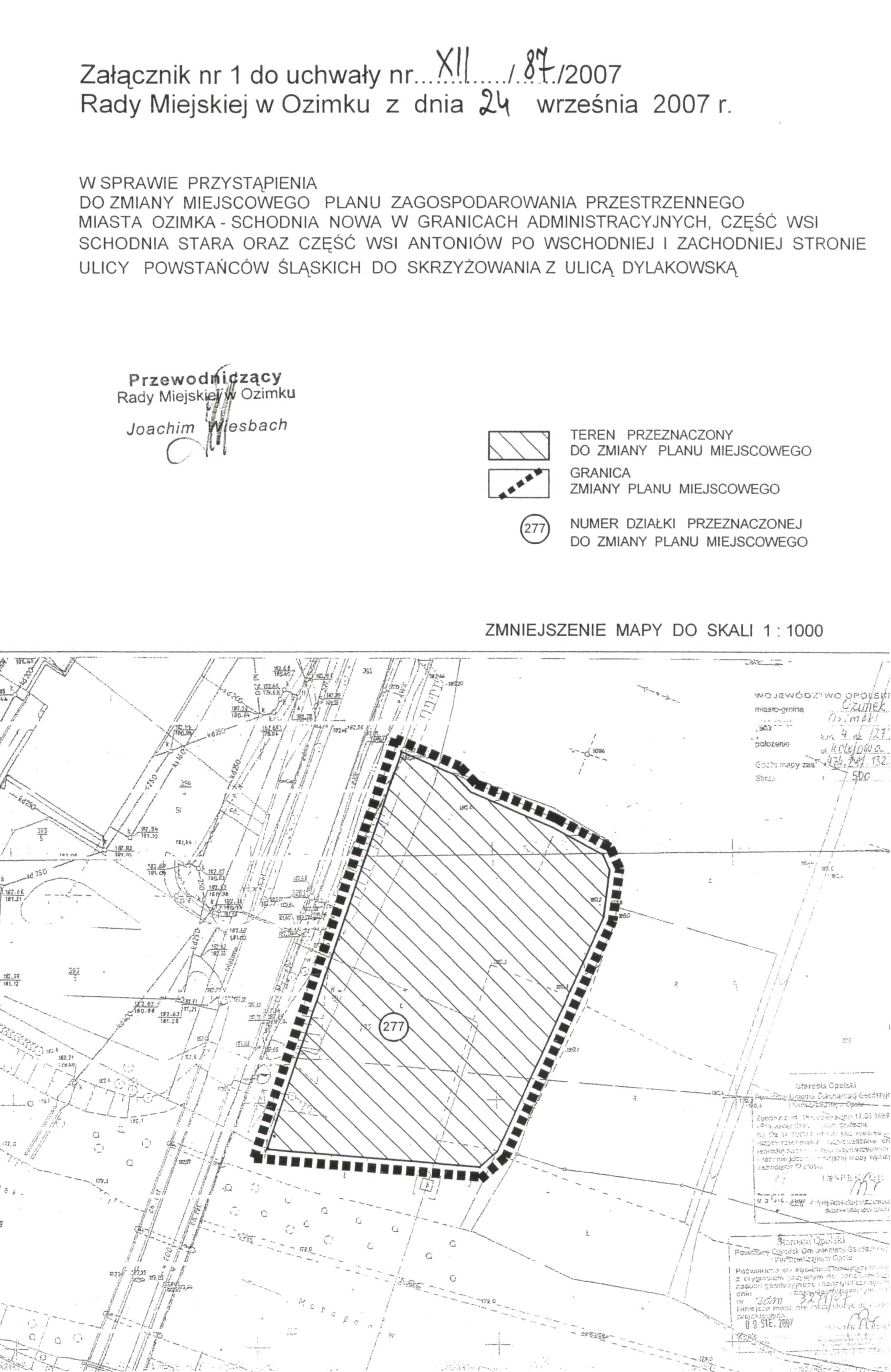 Na podstawie art. 17 pkt 1 ustawy z dnia 27 marca 2003 r. o planowaniu i zagospodarowaniu przestrzennym (Dz. U. Nr 80, poz.717) zawiadamiam o podjęciu przez Radę Miejską w Ozimku Uchwały Nr XII / 87 / 07 z dnia 24 września 2007 r. o przystąpieniu do zmiany miejscowego planu zagospodarowania przestrzennego miasta Ozimka – Schodnia Nowa w granicach administracyjnych, część wsi Schodnia Stara oraz część wsi Antoniów po wschodniej i zachodniej stronie ulicy Powstańców Śląskich do skrzyżowania z ulicą Dylakowską w granicach, które wyznaczają granice działki nr 277, k.m. 4 położonej przy ul. Kolejowej w Ozimku.